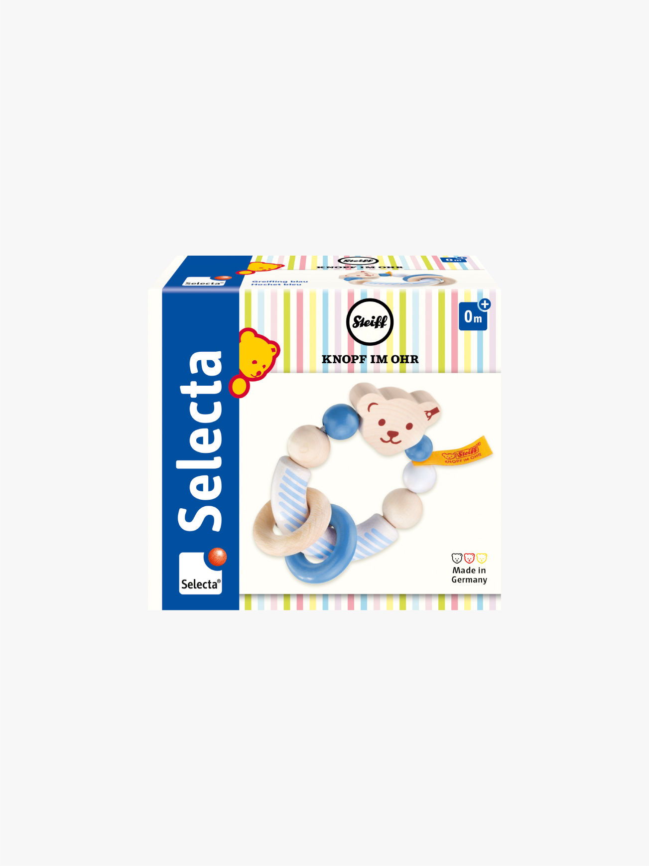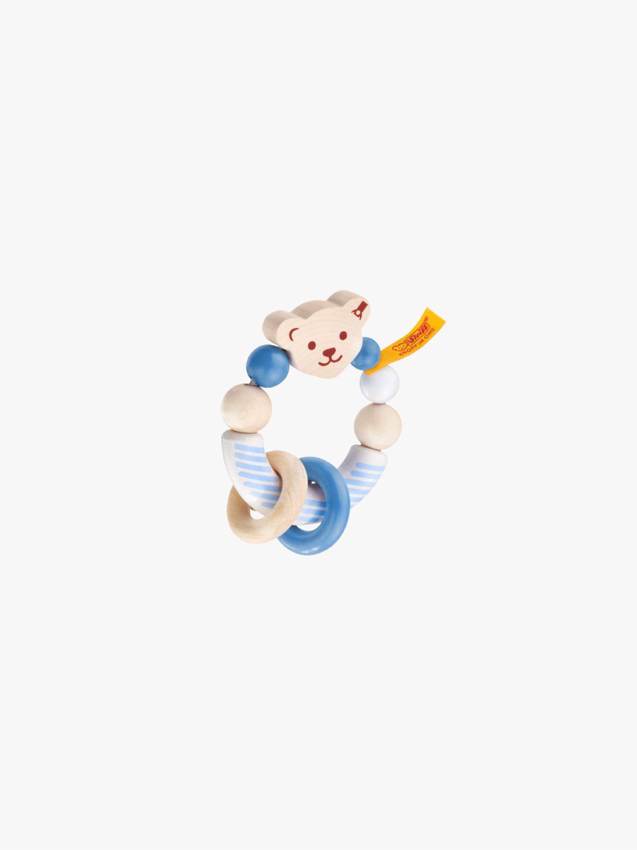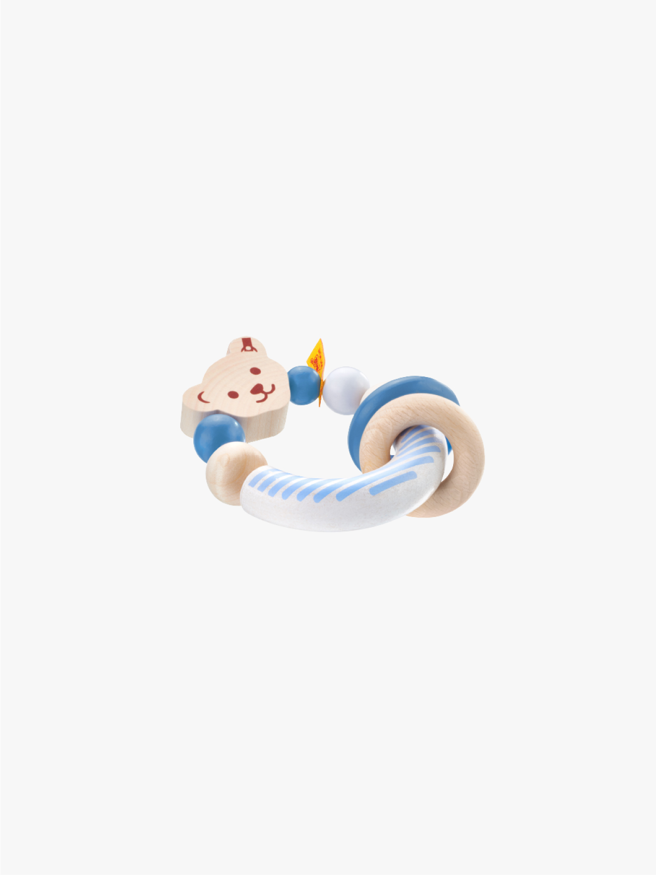Baby-Greifling aus Ahornholz zum Tasten, Fühlen und Be-Greifen. Fröhlich klappert der kleine Bär mit seinen Ringen. 9,5 cm.