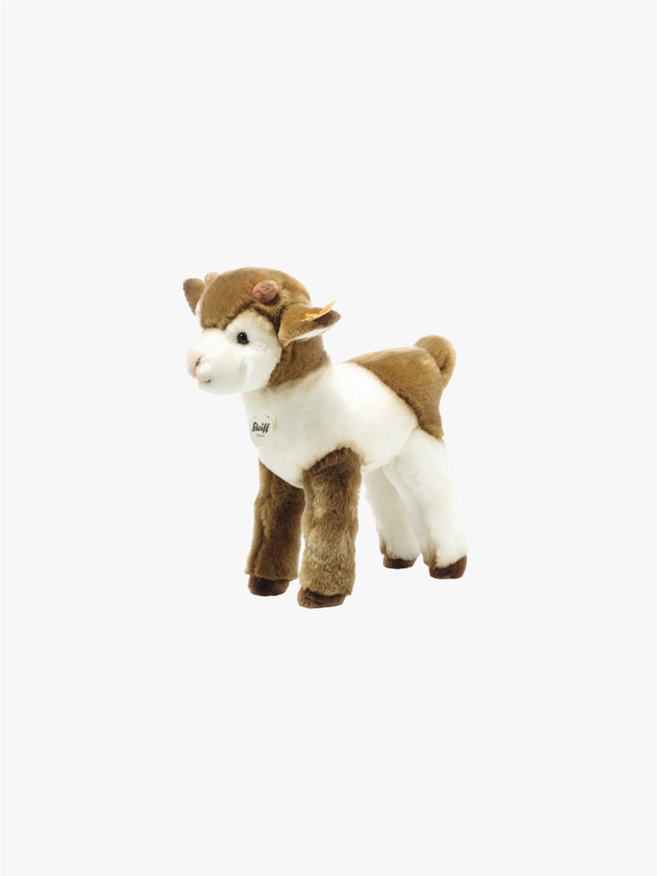 Zenzi Ziege steht mit einer Größe von 27 cm stabil auf ihren Beinen. Dafür sorgen eingearbeitete Drähte. Die Grundfarben dieses hübschen Wesens sind Braun und Weiß und aus kuschelweichem Webpelz. Der ganze Körper ist aufwendig mit Hilfe der Airbrushtechnik in Rosa und Braun bemalt. Der kleine Puschel ist in Braun gehalten. Die braunen Hörner stehen lustig vom Kopf ab. (Zertifizierungen CE)
